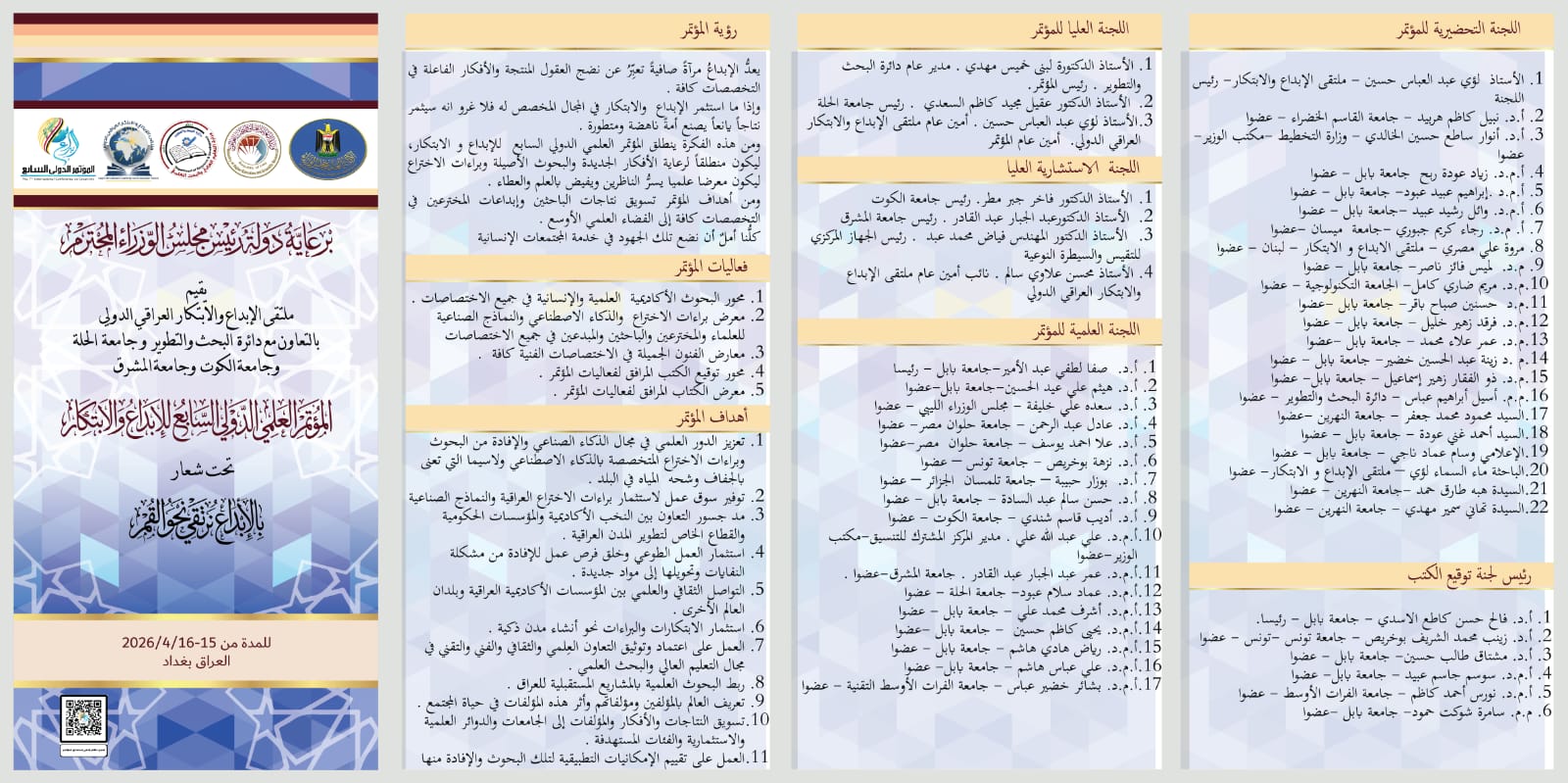 يقيم ملتقى الإبداع والابتكار العراقي الدولي بالتعاون مع دائرة البحث والتطوير وجامعة الحلة وجامعة الكوت وجامعة المشرق المؤتمر العلمي الدولي السابع للإبداع والابتكار وتحت شعار بالإبداع نرتقي نحو القمم للمدة من 15 الى 16 نيسان 2026 العراق - بغداد